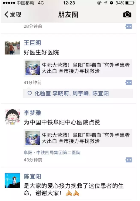 时间紧急,病情危重,患者已经出现休克状态,该院医护人员立刻同患者家属沟通献血事宜,却得知患者家族中无相同血型。医护人员随即与阜阳市中心血站联系,却得知阜阳市中心血站熊猫血告急!怎么办?!时间一分一秒流逝,患者出血量持续增加,随时有生命危险!该院医务人员即刻在院内外微信群、QQ群、朋友圈发出求救,同时与阜阳市广播电台取得联系,积极向广大市民求救,仅仅几分钟,整个朋友圈热心人士百余人转发此条消息,具有相同血型或联系方式的热心市民,在半个小时内就打爆了该院检验科主任的手机。经过多方联系,积极调配,19:00左右,阜阳市中心血站将别院提前预约的800毫升红细胞,400毫升血浆及时调配给该患者使用,所有人悬着的一颗心才落了下来。