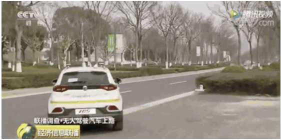 无人驾驶车辆上路测试 , 行人不多,但车辆密集,不时有大型货车开过, 遇到红灯,车会自己停下,掉头时,车会自动等后续车辆通过后再启动。