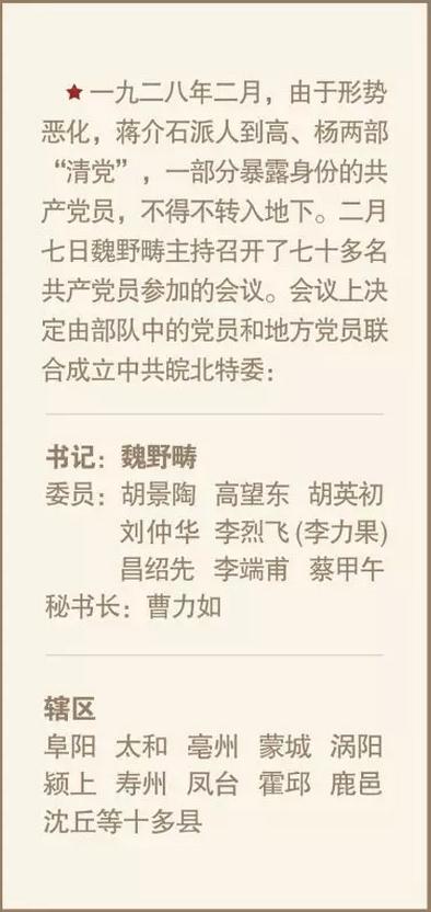 1928年2月中旬,魏野畴到行流、王官集一带,着手整顿了行流党的工作,介绍40余名农民入党,成立了中共行流区委。2月中旬,在中共皖北特委的帮助下,成立了中共阜阳县委,乔锦卿同志为书记,下辖行流城关、插花3个区委,1-8个支部,有党员100余人。之后,皖北特委在贡院街(特委机关驻地)、会老堂、奎星楼等处多次召开会议,研究起义事宜,要求即刻发动土地革命。正如魏野畴给中央写的《关于皖北政治、经济及党之组织经过、现在策略》报告中指出那样“皖北党组织迅速壮大,农村革命已经成熟”,“一致同意即刻发动土地革命,必能扩大至全皖北。破坏十军及十九军,引导五、六万农民”走上革命的道路。